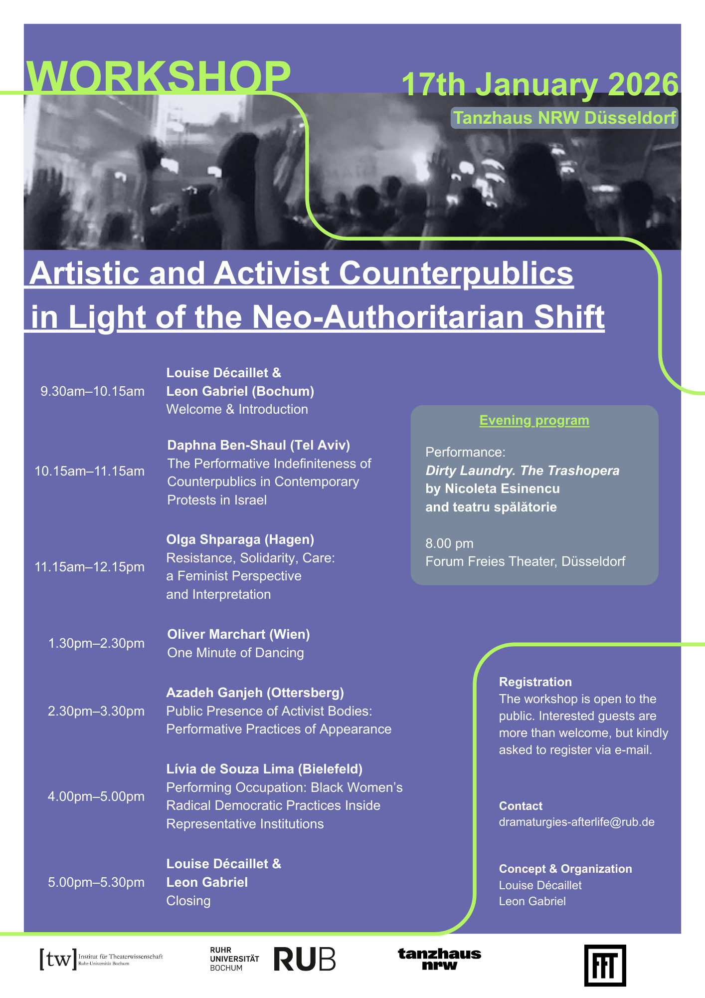 The neo-authoritarian tendencies that today threaten democracies on a global scale take on unique forms depending on cultures and forms of government in which they develop. Alongside the decisions of state power such as the tightening of migration policies, attacks on justice and the separation of powers, freedom of the press and academic research, we also witness a brutalization of social relations manifested through antifeminist backlash and queer- and transphobia, the rise of racist and anti-Semitic attacks, and the ever-stronger presence of identitarian far-right groups in the public space – as well as their digital violence. While this brutalization clearly endangers democratic life itself, it also urges to reexamine the very spaces and practices of protest and opposition, of resistance and solidarity, as well as their political performativity. Therefore, this workshop aims to discuss the new challenges faced by contemporary counterpublics and counter-communities in different world regions and the practices of resistance they enable against neo-authoritarian politics. How do these practices of assembling, protesting and commoning emerge in the face of their ongoing repression, and how do they oppose not only state power, but also attempt to escape other forms of economic, political, social, and cultural domination? How do artists and activists utilize digital, street, and community spaces to express their demands, forge alliances, and create alternative spaces of togetherness? And how are they testing other forms of society?